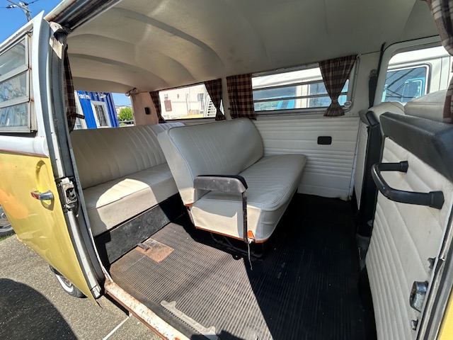 人気の前期モデルBaywindowスタンダードバスのベース車両です。ボディーカラーは鮮やかなイエロー/ホワイトのツートン、インテリアは清潔感あるホワイトメッシュ、ヒーター装備で快適にお使いいただけます。ボディを修復するリフレッシュプラン(お好きなカラーにペイントも可能)と現状ベースで車検取得して直ぐに乗り出すリーズナブルプランの2方向をご案内します。